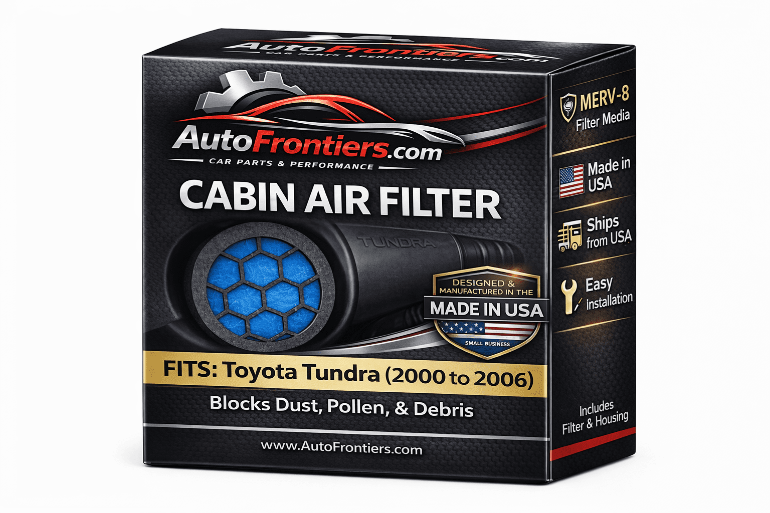 Add modern cabin air filtration to your 1st Generation Toyota Tundra (2000–2006) with this complete Cabin Air Filter Kit, which includes both a vehicle-specific filter housing and MERV-8 filter media. Designed for Sequoias that did not come equipped with a factory cabin filter, this system helps reduce dust, pollen, and road debris entering the cabin.