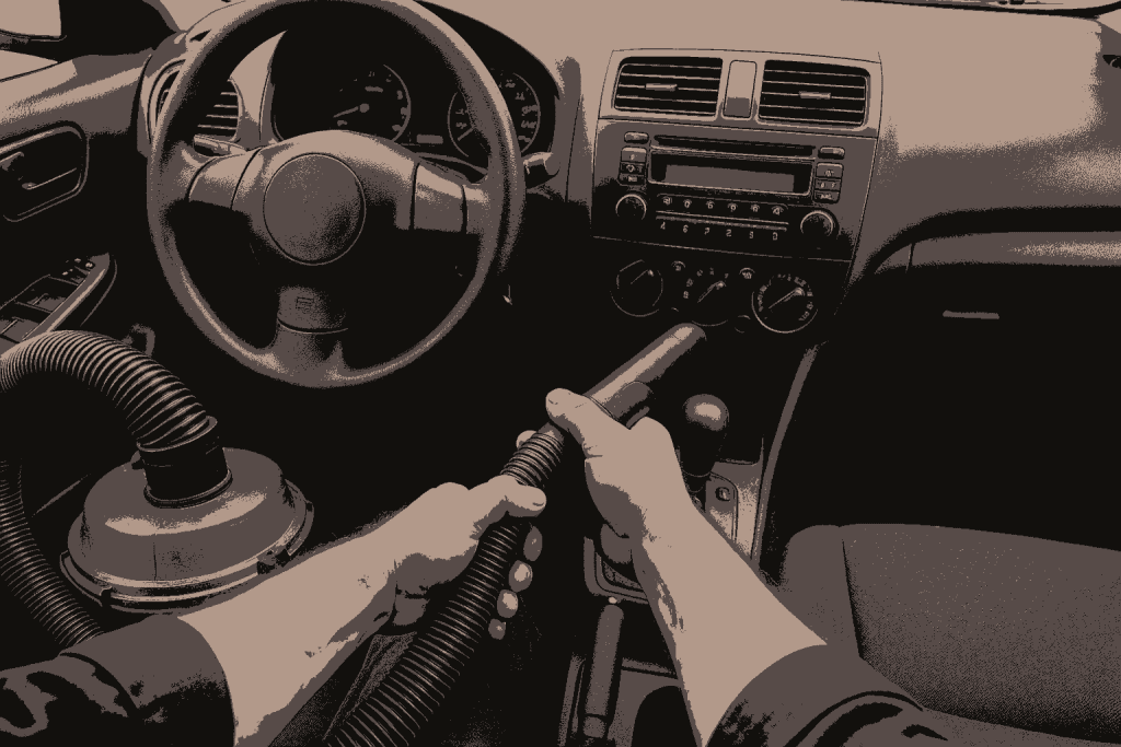 Start by removing all trash, floor mats, and personal items. Vacuum the seats, carpets, and crevices using a shop vac with a crevice tool. For fabric seats and carpet, use a carpet extractor or scrub by hand using a foaming upholstery cleaner.